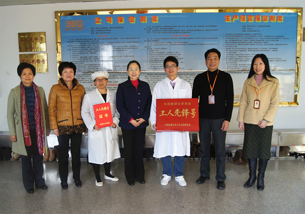 近日,片仔癀生产车间(一车间)被中国能源化学工会授予全国能源化学系统“工人先锋号”光荣称号。2014年1月14日下午, 省财贸轻纺烟草医药工会工委主任陈赛玲在市总工会副主席黄跃秋的陪同下来到公司片仔癀生产车间,将“全国能源化学系统工人先锋号”牌匾授给片仔癀生产车间。这是该车间继获得“省工人先锋号”荣誉后首次获得的“国”字号荣誉。