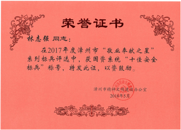 2017年漳州市文明办开展“敬业奉献之星”系列标兵评选活动。此次活动以培育和弘扬“工匠精神”,围绕“服务大发展,建设新福建”的主题。