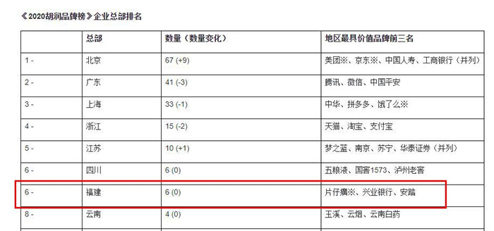 最具价值品牌全国200强总部地域分布数量福建省排第六,有6个,其中三大最具价值品牌是片仔癀、兴业银行、安踏。