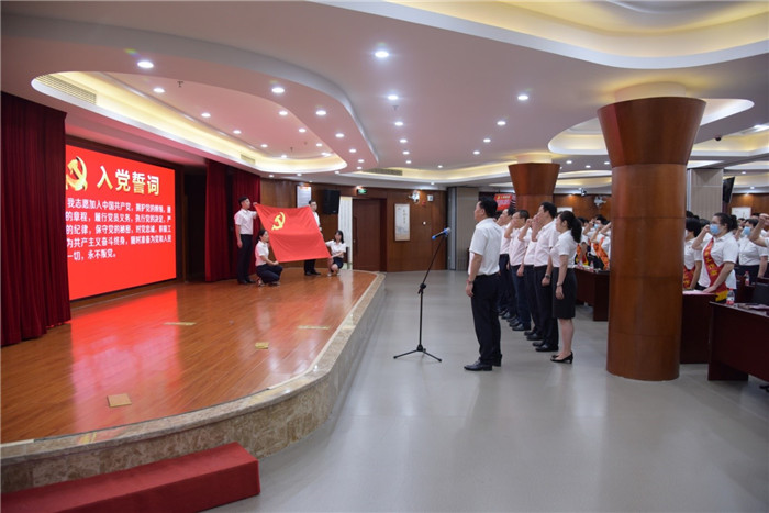 最后,公司董事长潘杰带领新老党员重温入党誓词,全体党员面向鲜红的党旗庄严宣誓,不忘入党初心。