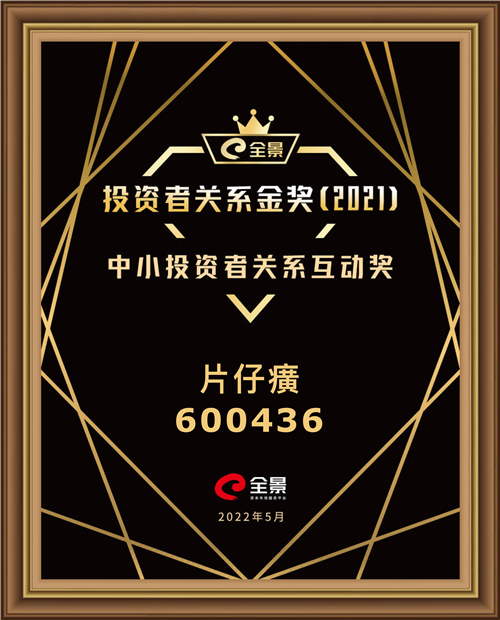 近日,由全景网主办、南开大学中国公司治理研究院参与推出的“全景投资者关系金奖”2021年度全国性评选,经过专家顾问组最后环节的评审,获奖榜单正式揭晓。漳州片仔癀药业股份有限公司荣获“投资者关系金奖(2021)-中小投资者互动奖”和“投资者关系金奖(2021)-最佳新媒体运营奖”。