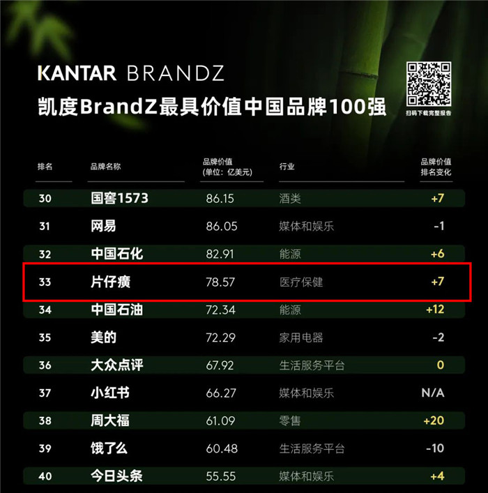 8月25日,2022年凯度BrandZ最具价值中国品牌百强榜单发布。片仔癀位列第33位,相较去年上升7位,品牌价值再创新高。