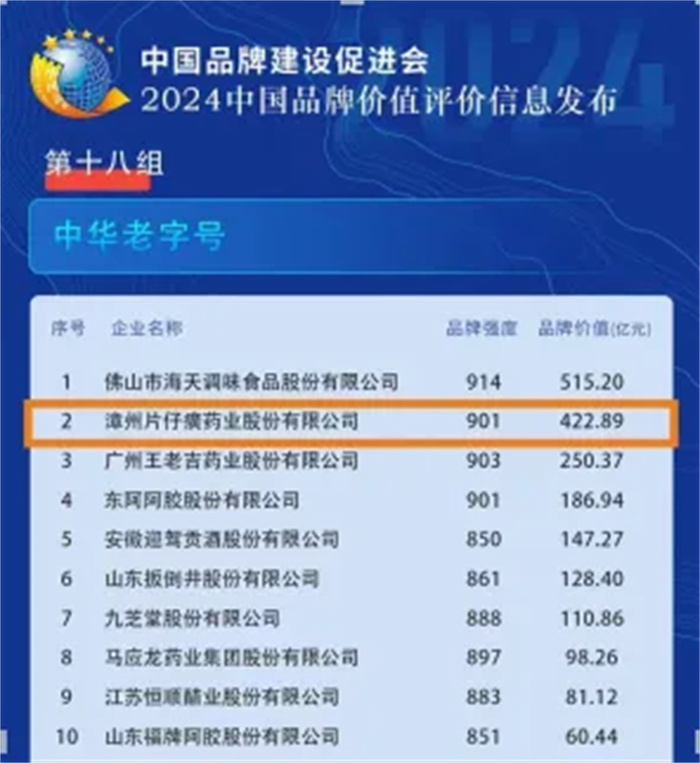 图片说明:2024“中华老字号品牌”第二位   图片来源:片仔癀
