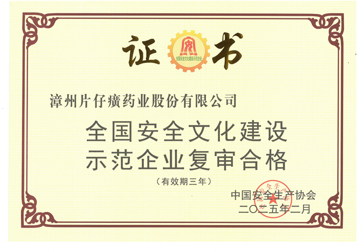 片仔癀公司顺利通过“全国安全文化建设示范企业”复审