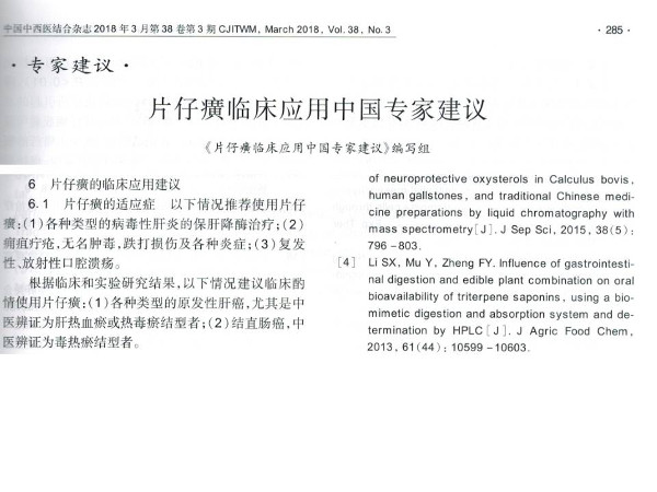 由中国医师协会中西医结合医师分会组织编写的《片仔癀临床应用中国专家建议》总结了片仔癀已发表的药理毒理、临床、质量标准研究文献资料,形成《片仔癀临床应用中国专家建议》,于20183月份发表于中国中西医结合杂志2018年第3期。