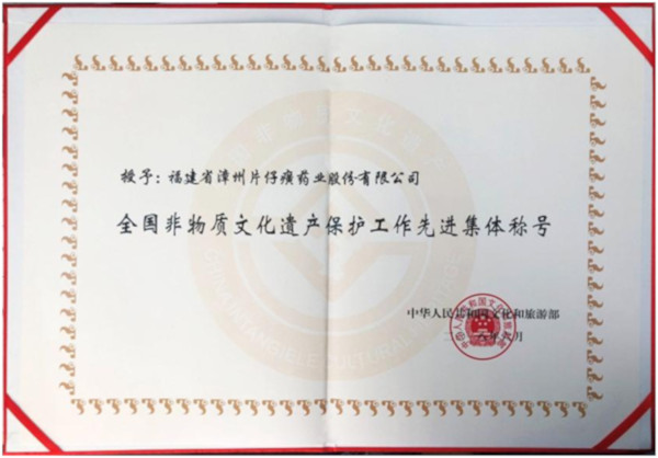 根据《文化部关于评选全国非物质文化遗产保护工作先进集体和先进个人的通知》(文非遗函〔2017〕1204号),确定首批全国非物质文化遗产保护工作先进集体50个、先进个人99名。其中,福建省仅漳州片仔癀药业股份有限公司和福建省非物质文化遗产保护中心荣获全国非物质文化遗产保护工作先进集体这一殊荣。