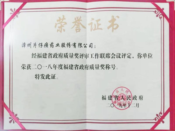 2018年度福建省政府质量奖(证书)