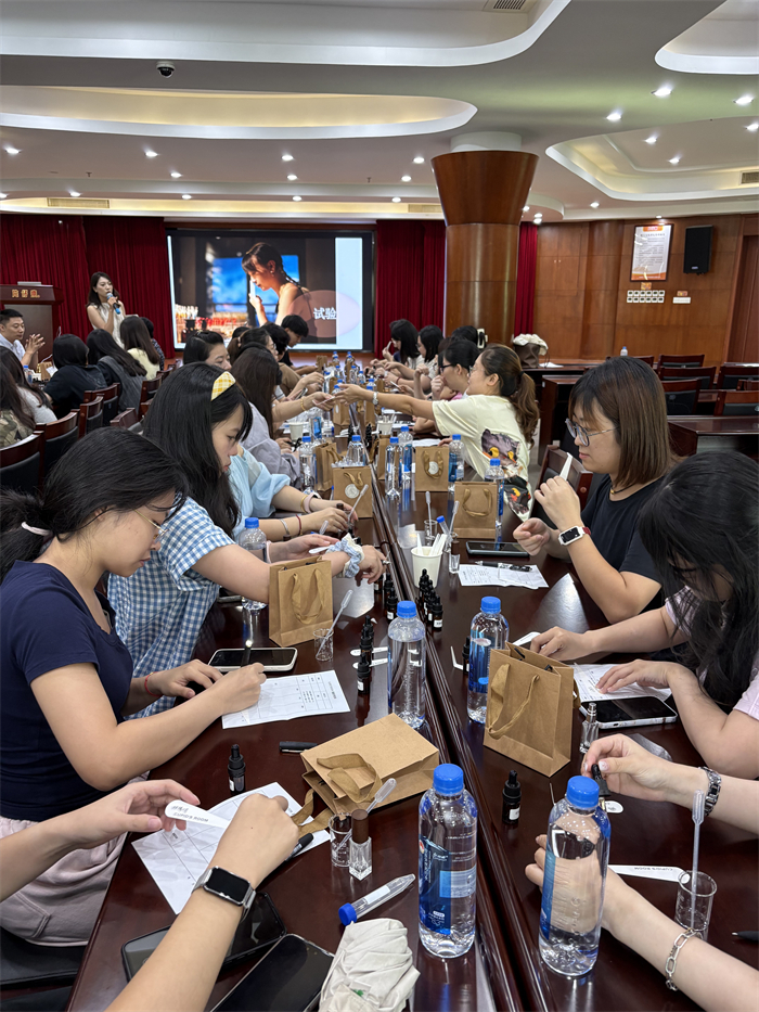 在“香水调制DIY”环节,员工们化身“调香师”,在老师的指导下开启创作之旅。现场提供玫瑰、檀香、茉莉等数十种天然香基原料,搭配专业实验器皿,参与者通过“赏香、品香、配比、调和”四步流程,将个人审美与情感融入作品。有人以清新果香寄托青春记忆,有人用沉稳木质调诠释职场态度,更有团队携手调制“协作之香”,在互动中打破部门壁垒,增进默契。