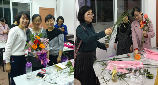 相比于烹饪课活跃的气氛,插花课就比较安静了。这门课程同样有理论讲解和实际操作两个部分。培训的讲师在课上讲的理论逐渐从浅变深,一个晚上实际操作的时间一次比一次长,操作内容也从个人示范慢慢变成学员分组操作。看到自己亲自动手完成的作品,学员们不禁纷纷露出笑容,还带着自己的杰作留下了“全家福”。大家通过这次课程,感受到了插花的乐趣,陶冶了自己的情操,缓解了平日的工作压力,还加强了工作团结力。