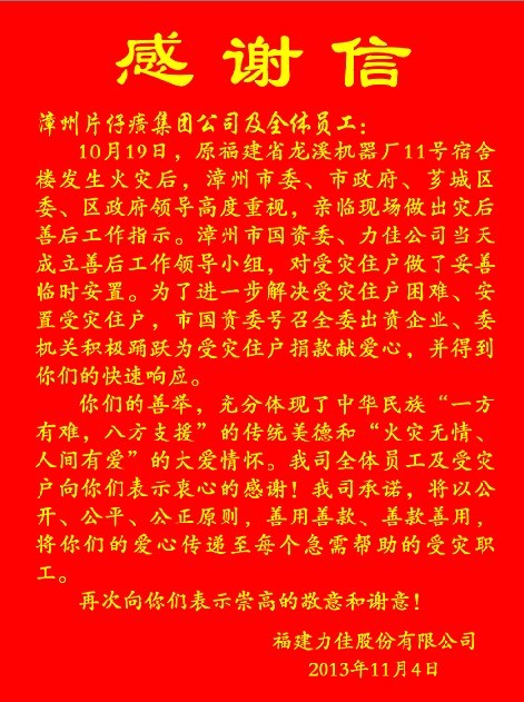 2013年10月19日上午7时许,位于芗城区漳福路力佳公司的一幢三层旧集体宿舍不慎发生火灾,68家住户近150多名职工受灾,财产损失80余万元。“火灾无情,人间有爱”,片仔癀药业公司领导立即召开动员大会,号召广大干部职工伸出援手、奉献爱心,尽己所能帮助受灾群众度过难关。