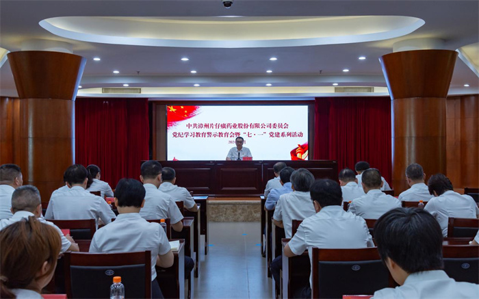 6月27日下午,漳州片仔癀药业股份有限公司党委举行党纪学习教育警示教育会,药业公司在家领导班子成员、中层管理人员、权属子公司负责人、各党(支部)书记、纪检委员等参加会议。公司党委书记、董事长林志辉主持会议并讲话。