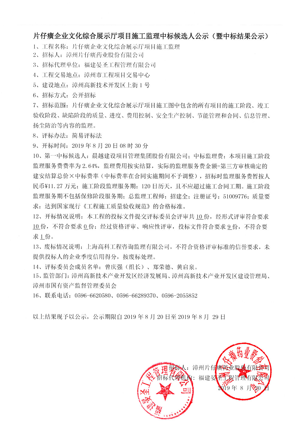 片仔癀企业文化综合展示厅项目施工监理中标候选人公示(暨中标结果公示)