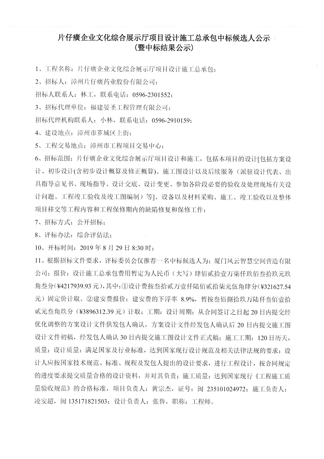 片仔癀企业文化综合展示厅项目设计施工总承包中标候选人公示